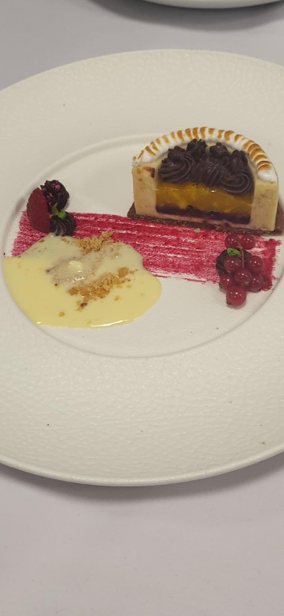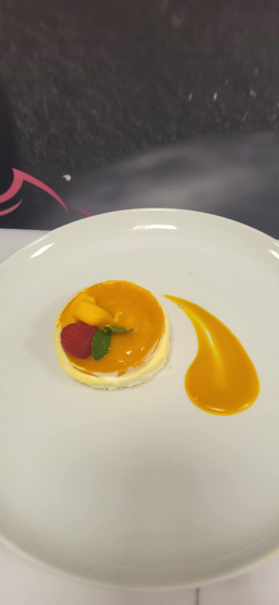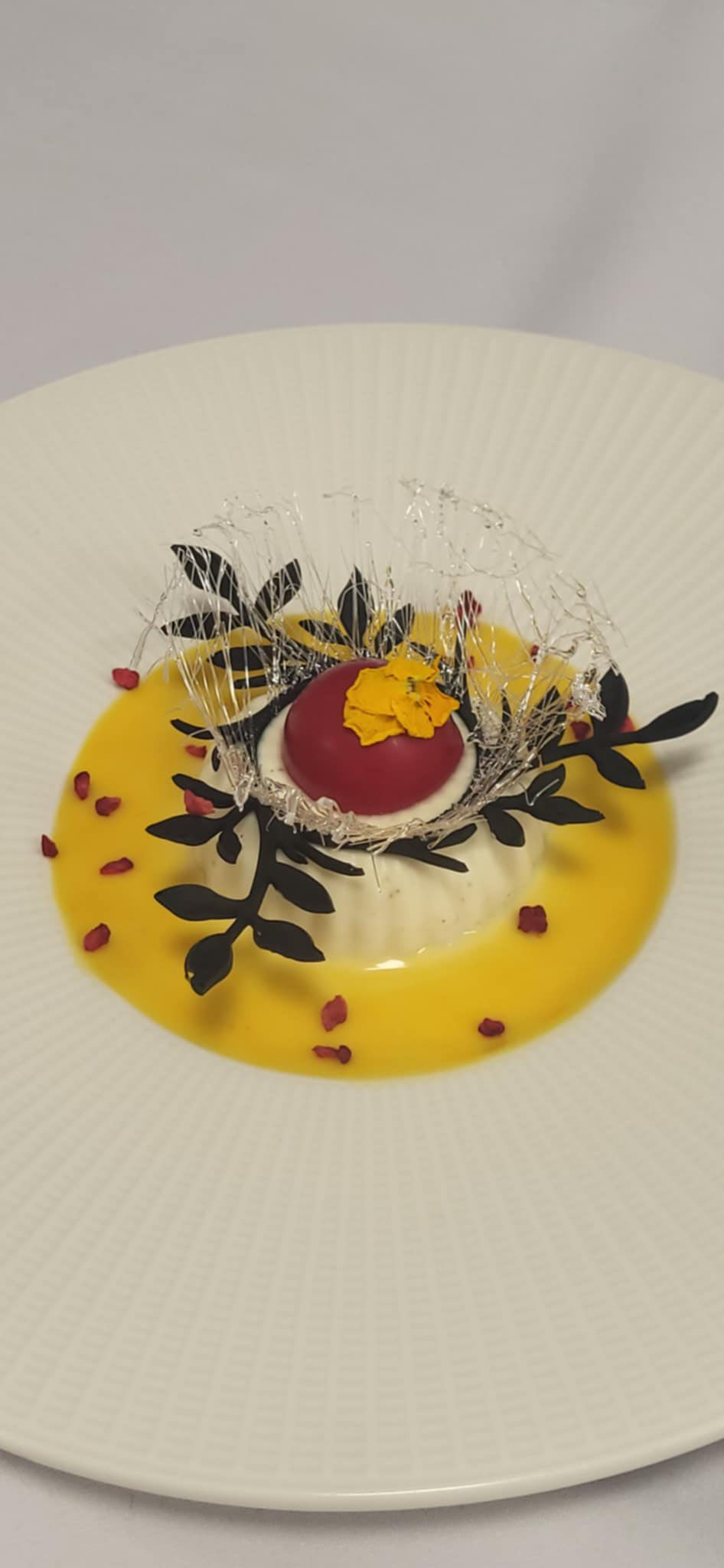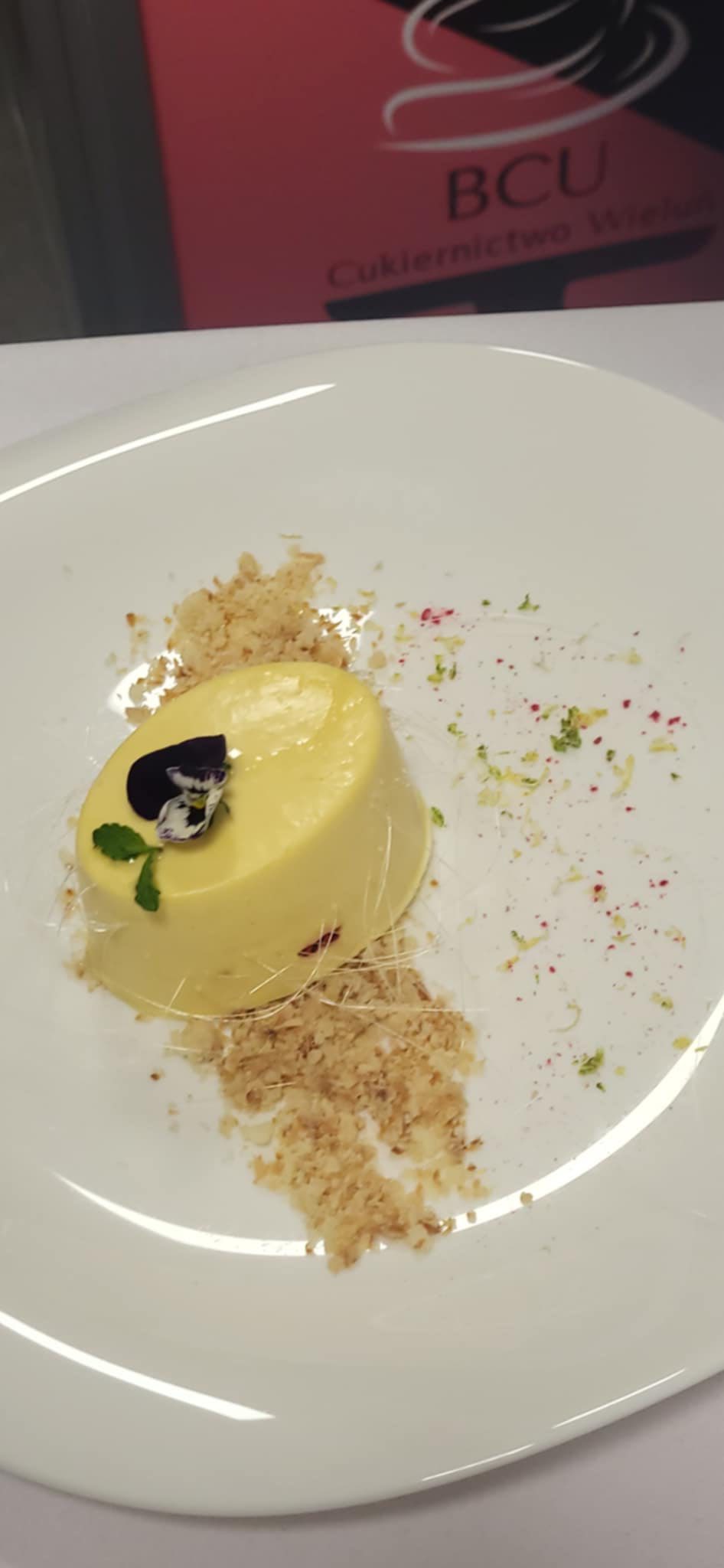 W swoich monoporcjach przygotowały mus o smaku wanilia-mango z nadzieniem z żelki o smaku mango , w otoczce z liofilizowanych malin na kokosowo-maślanej kruszonce. Jako element dekoracyjny i ciekawy pod względem tekstury zostało wykonane " szklane gniazdko" z izomaltu. Julka i Patrycja spisały się wspaniale. Dziekujemy pięknie za godne reprezentowanie szkoły, odwagę, chęci i realizowanie swoich marzeń. Opiekę nad dziewczynami pełniła Anna Kromoska - Pluta