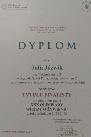 Z prawdziwą satysfakcja informujemy, że Jula Józwik uczennica klasy IV TG uzyskała tytuł finalisty XXX Ogólnopolskiej Olimpiady o Żywieniu, która odbyła się w dniach 25-27 marca w Szczecinie. Olimpiada organizowane jest przez Pomorską Akademię Medyczną.