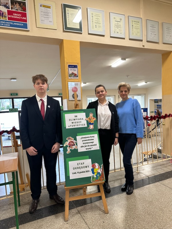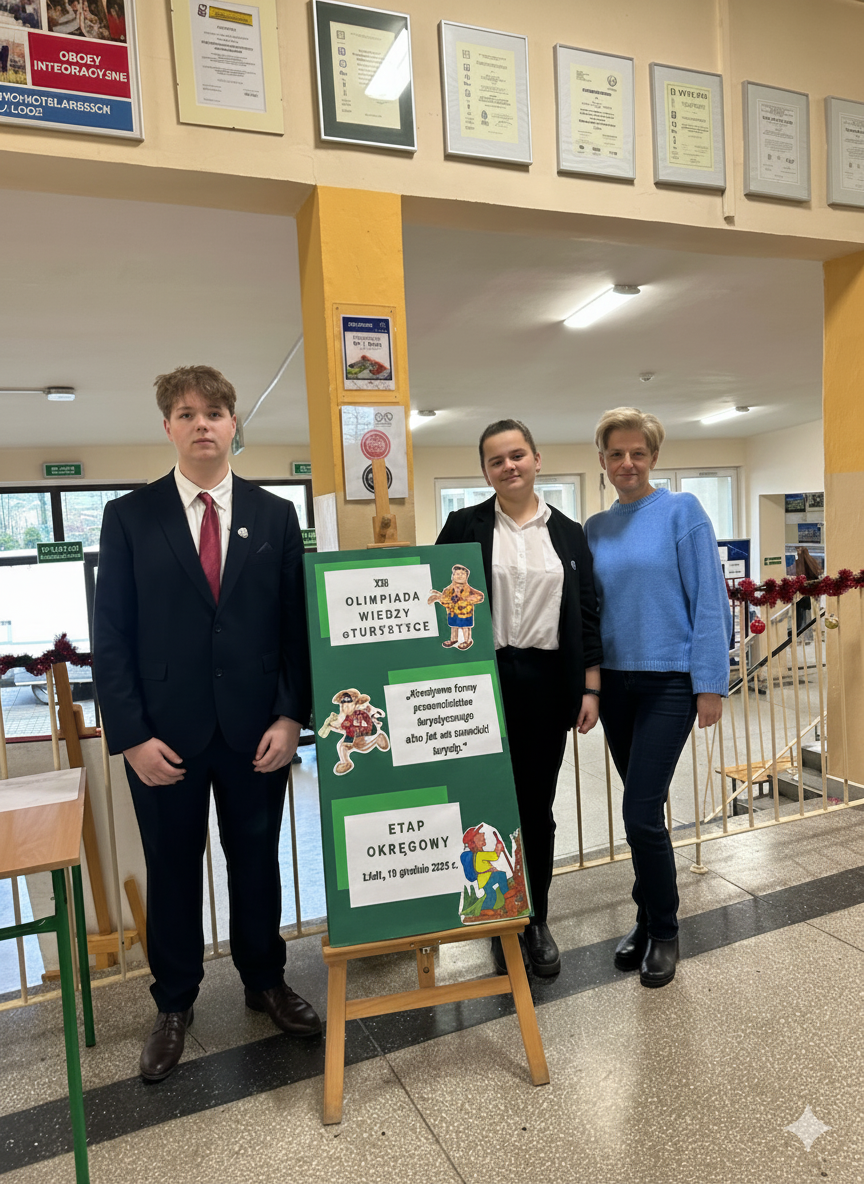 W dniu 10 grudnia 2025 roku Zuzia Gaworek i Kuba Ciupiński uczniowie klasy 3RT o godzinie 12:00 przystąpili do zmagań w okręgowym etapie XIII Ogólnopolskiej Olimpiady Wiedzy o Turystyce.