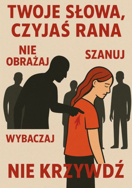 Uczniowie klas 1 i 3 technikum reklamy przygotowali cyfrową wystawę plakatów, które pokazują, że słowa mają moc — mogą ranić, ale też wspierać i budować.